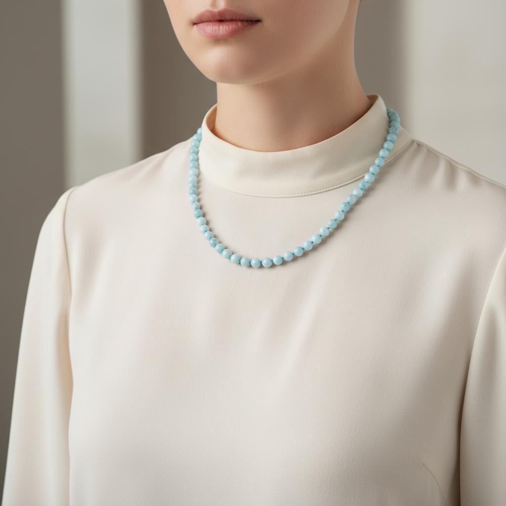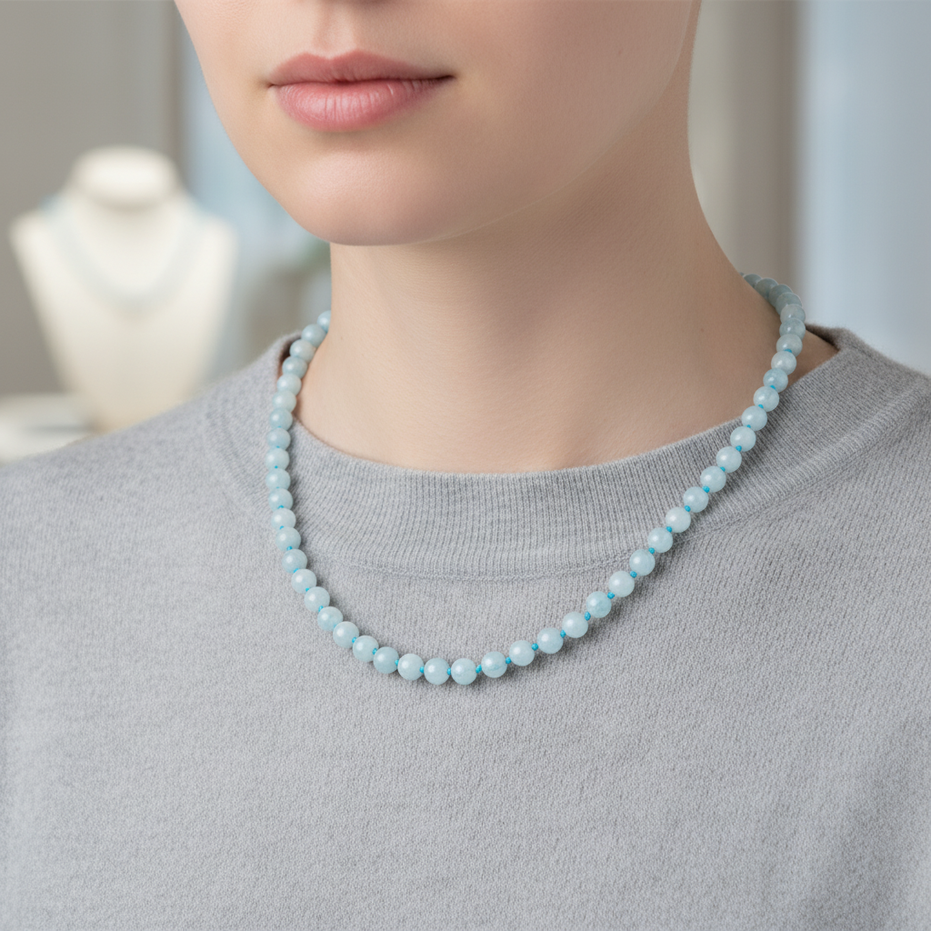 Akuamarin 6 mm Düğümlü Doğal Taş Kolye – Unisex El İşçiliği