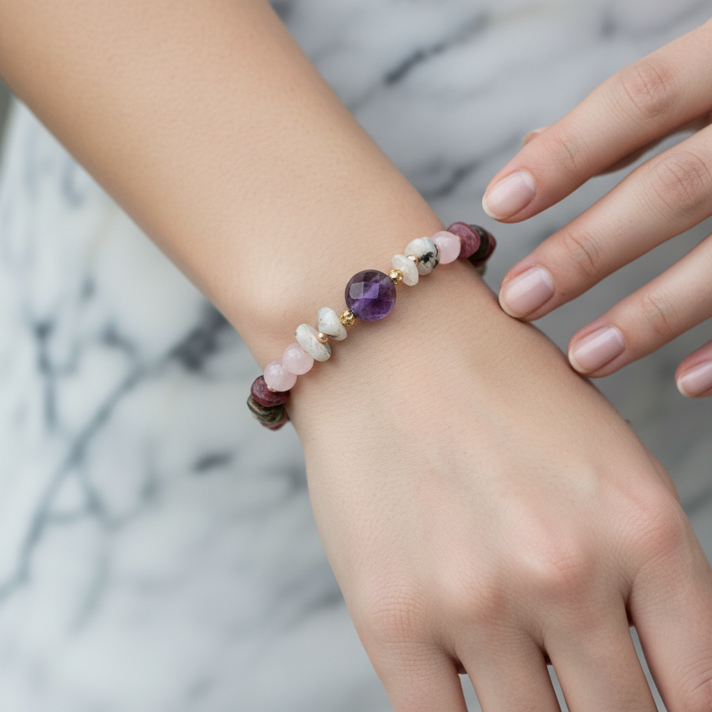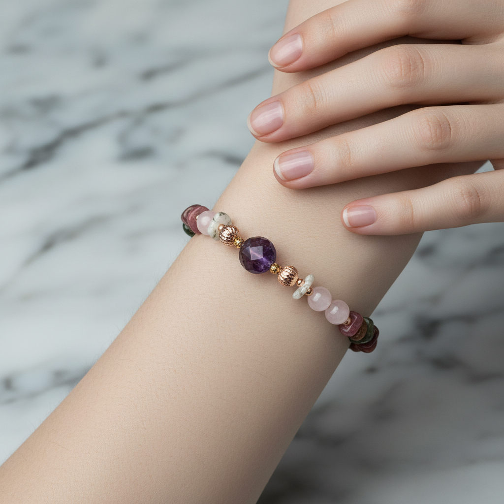 Ametist, Ay Taşı, Pembe Kuvars & Renkli Turmalin Doğal Taş Bileklik – Özel Tasarım