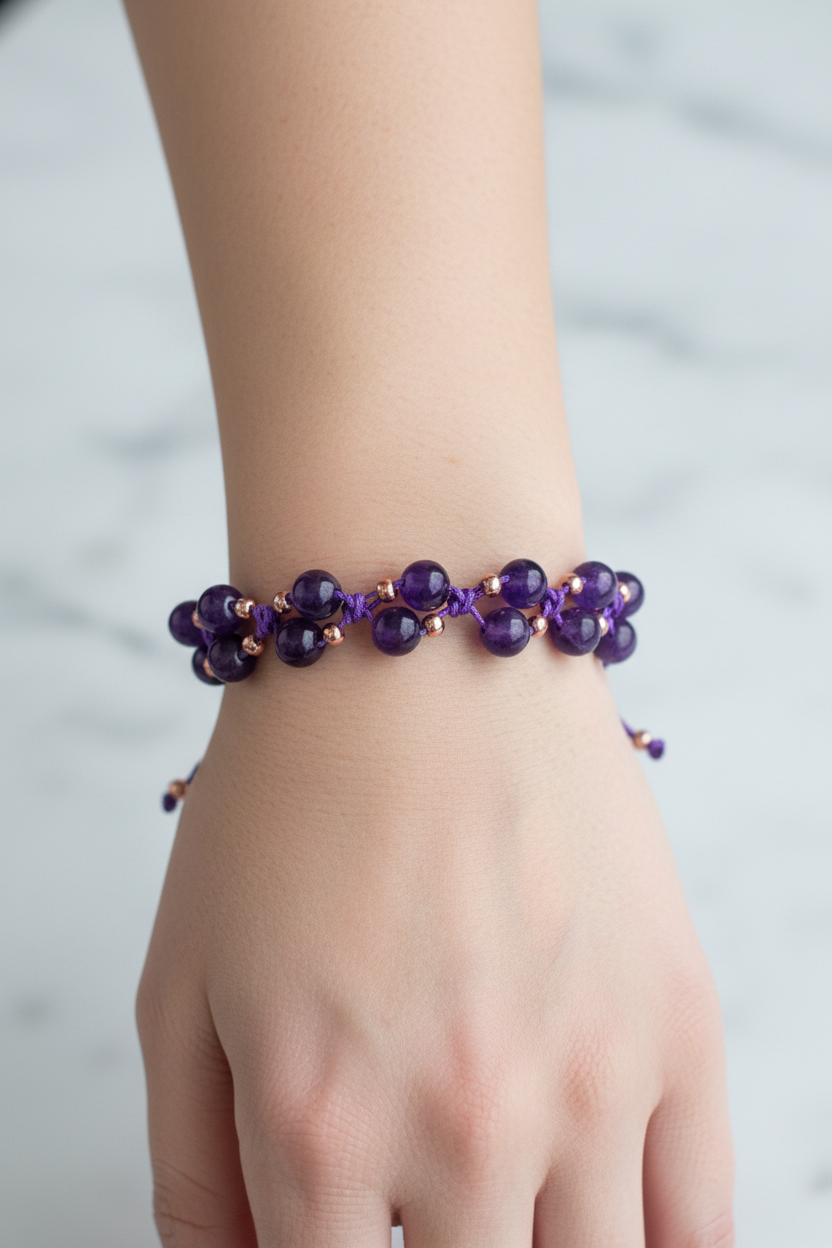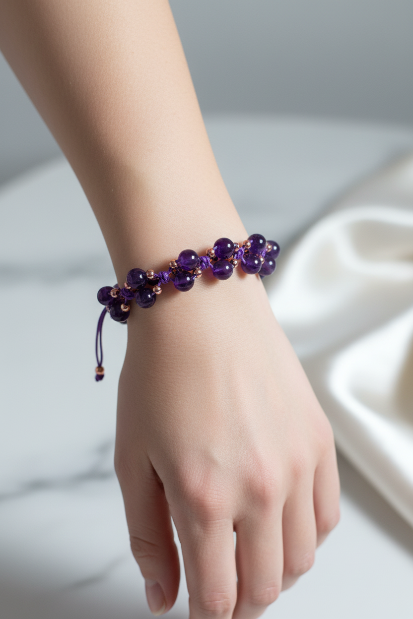 Ametist Doğal Taş Merdiven Kapama İpli Bileklik – Ayarlanabilir Tasarım