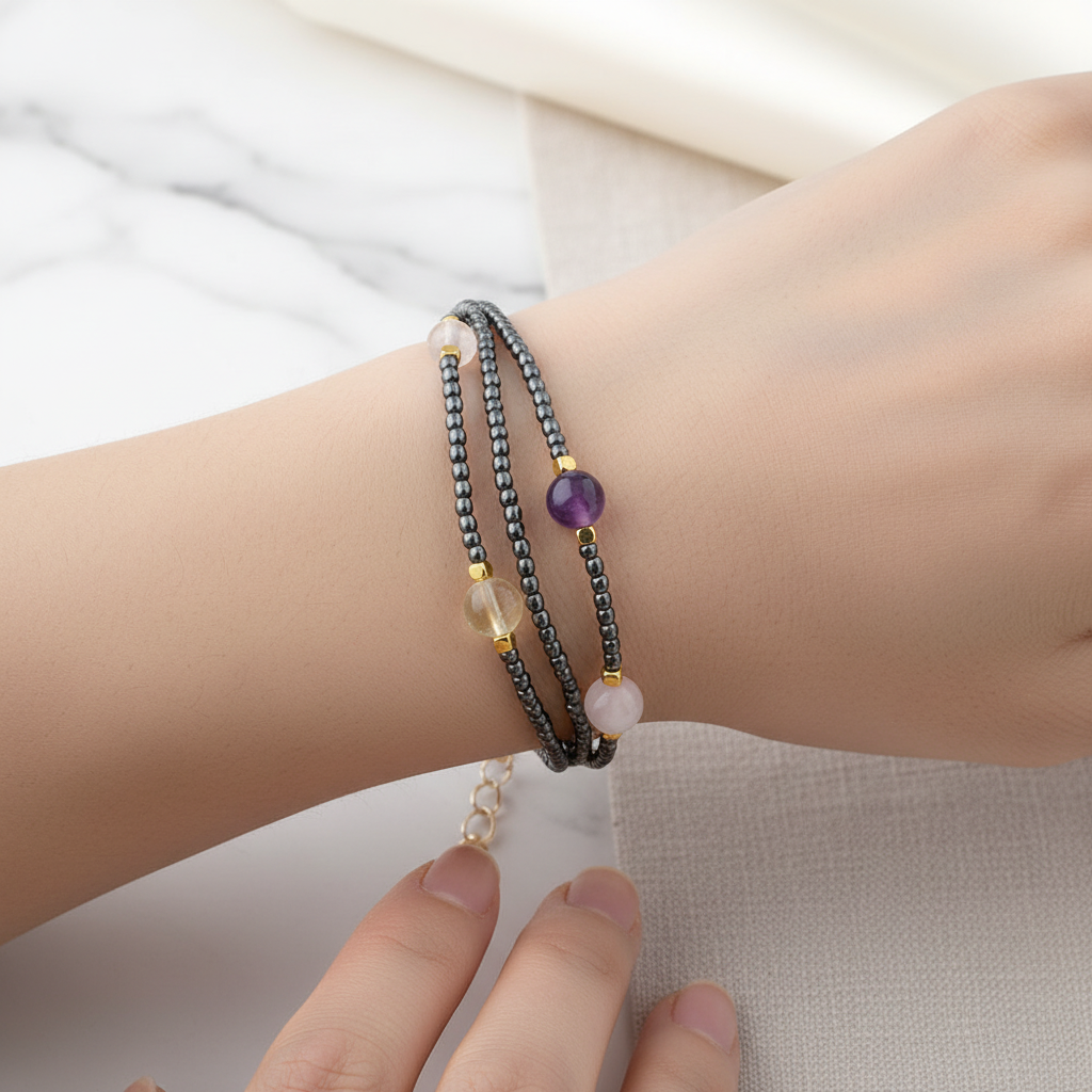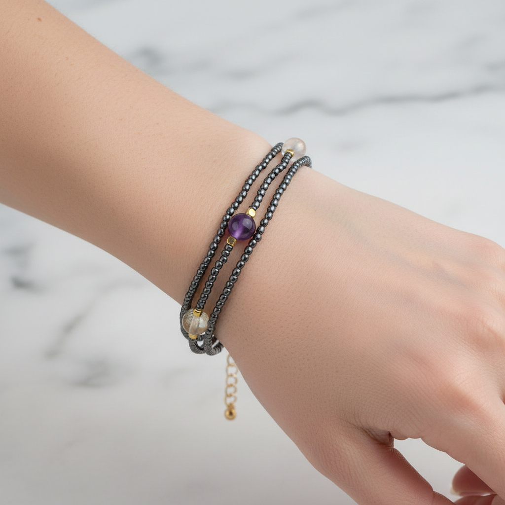 Ametist – Sitrin – Ay Taşı – Hematit Altın Kaplama Doğal Taş Bileklik – El İşçiliği