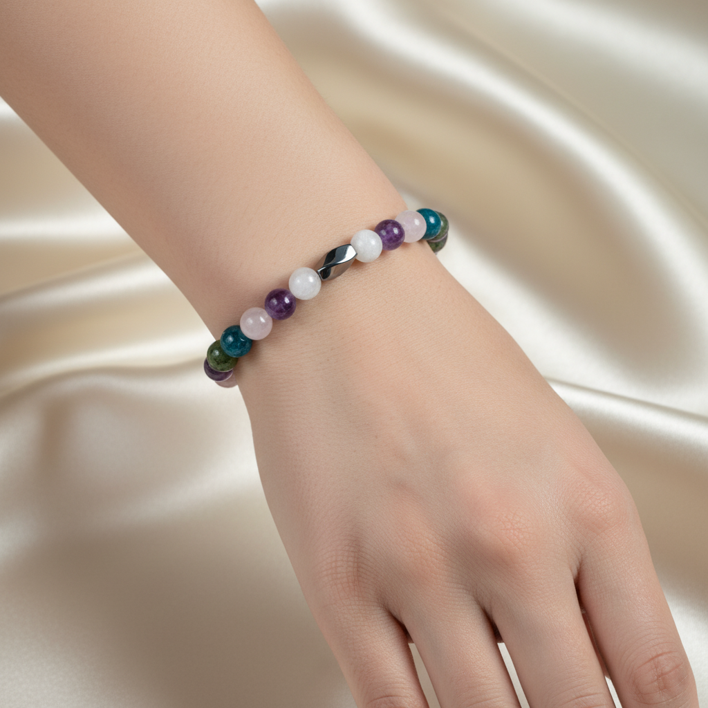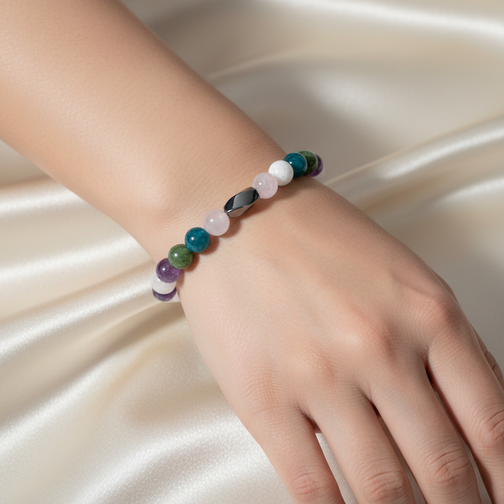 Balık Burcu Doğal Taş Bileklik – Ametist, Ay Taşı, Mavi Apatit, Pembe Kuvars & Yeşim