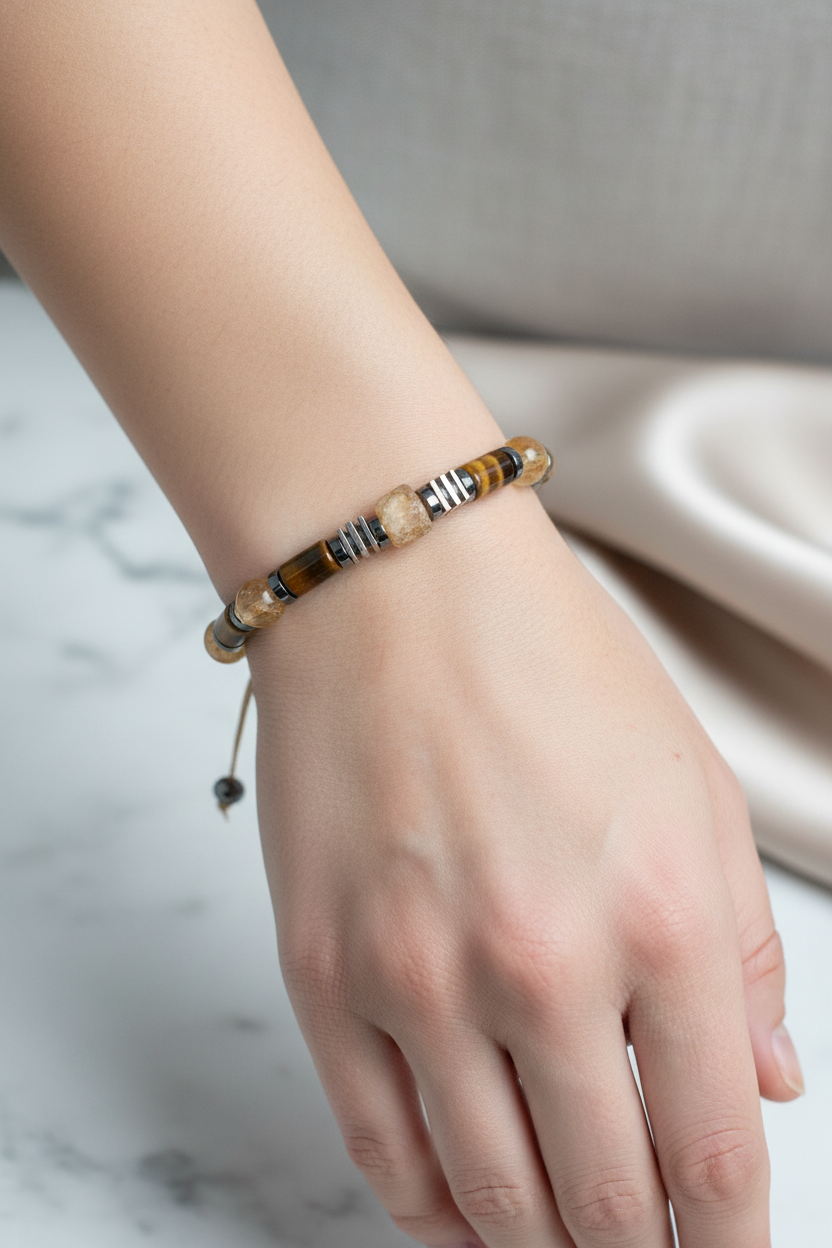 Kaplan Gözü, Sitrin ve Hematit Doğal Taş Bileklik – 8 mm İpli Ayarlanabilir, Unisex Tasarım