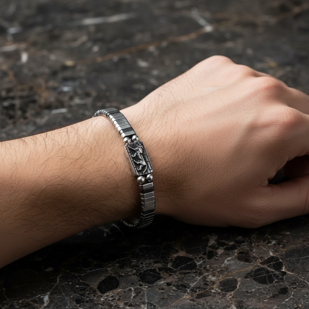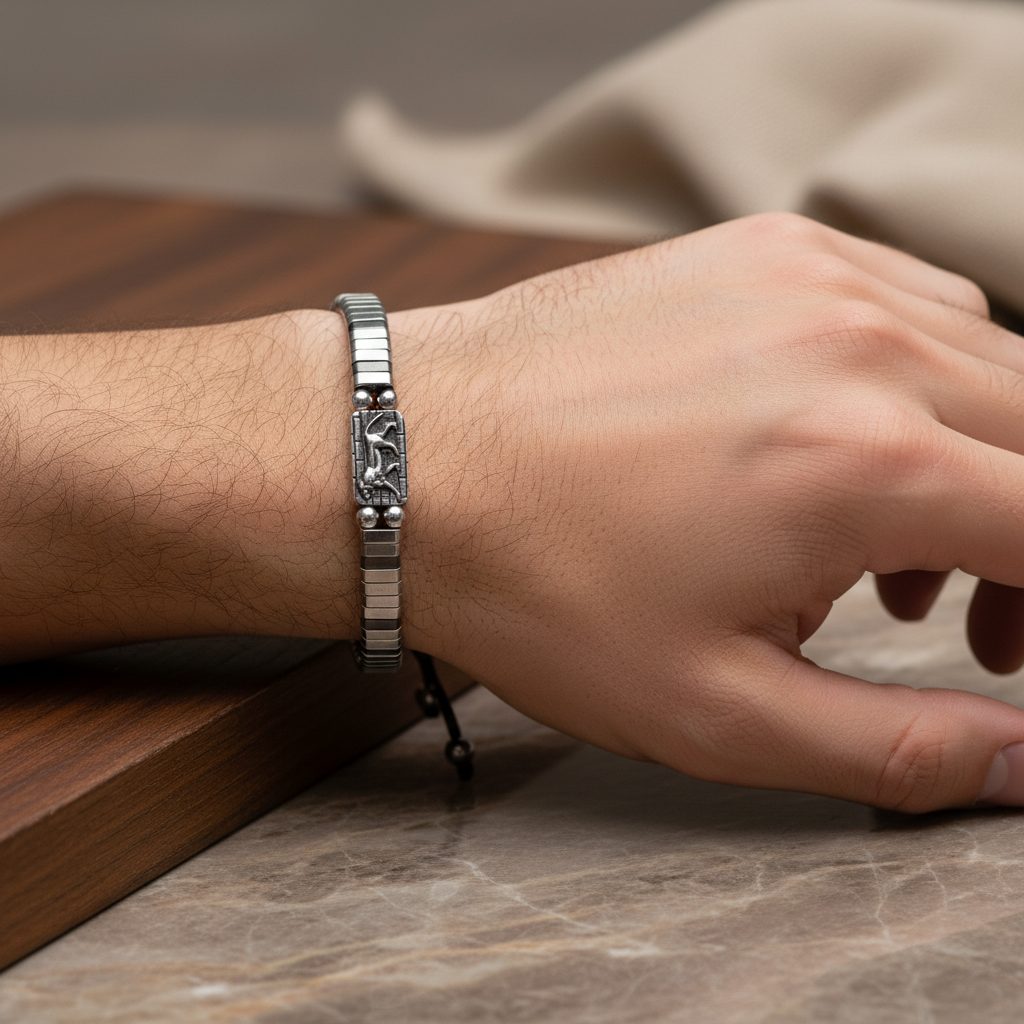 Hematit taşının metalik parlaklığı, 925 ayar gümüş detaylarla birleşerek güçlü ve modern bir erkek bileklik tasarımına dönüşüyor. El işçiliğiyle özenle hazırlanan bu özel parça; günlük kombinlerde karizmatik bir stil sunarken, özel günlerde de sofistike bir tamamlayıcıdır. Maskülen çizgisi ve dayanıklı yapısıyla zamansız bir aksesuar olarak öne çıkar.