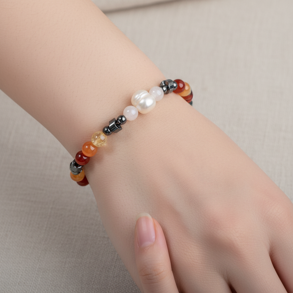 Hematit, Pembe Kuvars, İnci, Sitrin, Karnelyan Akik & Kırmızı Akik Doğal Taş Bileklik – Özel Tasarım