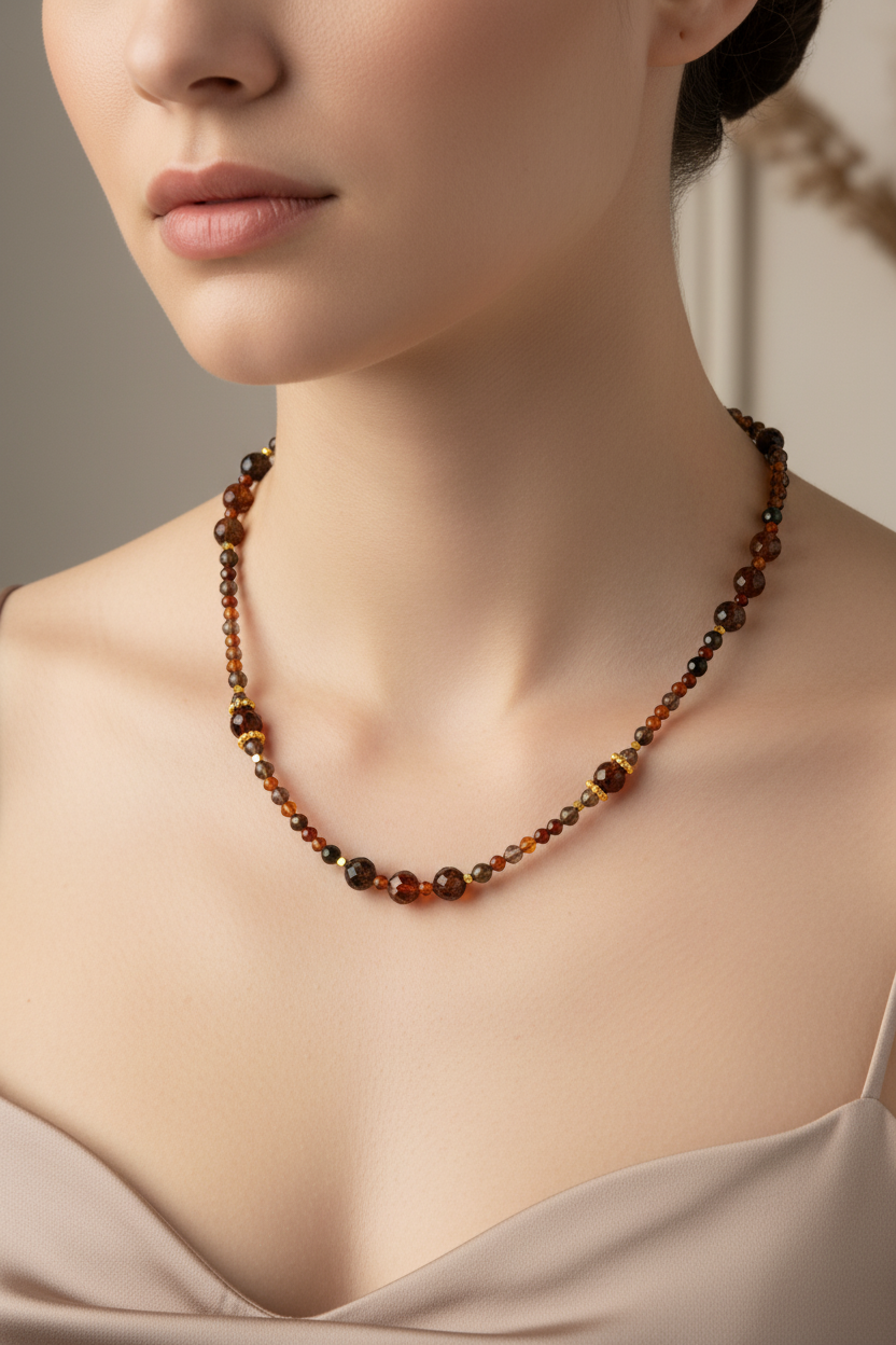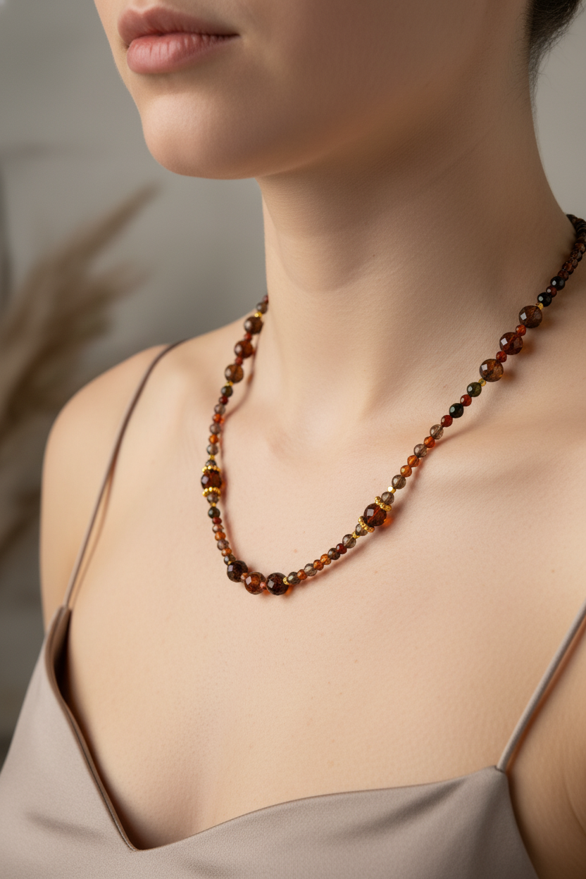 Hessonit Lal, Dumanlı Kuvars & Obsidyen Doğal Taş Kolye – Özel Tasarım