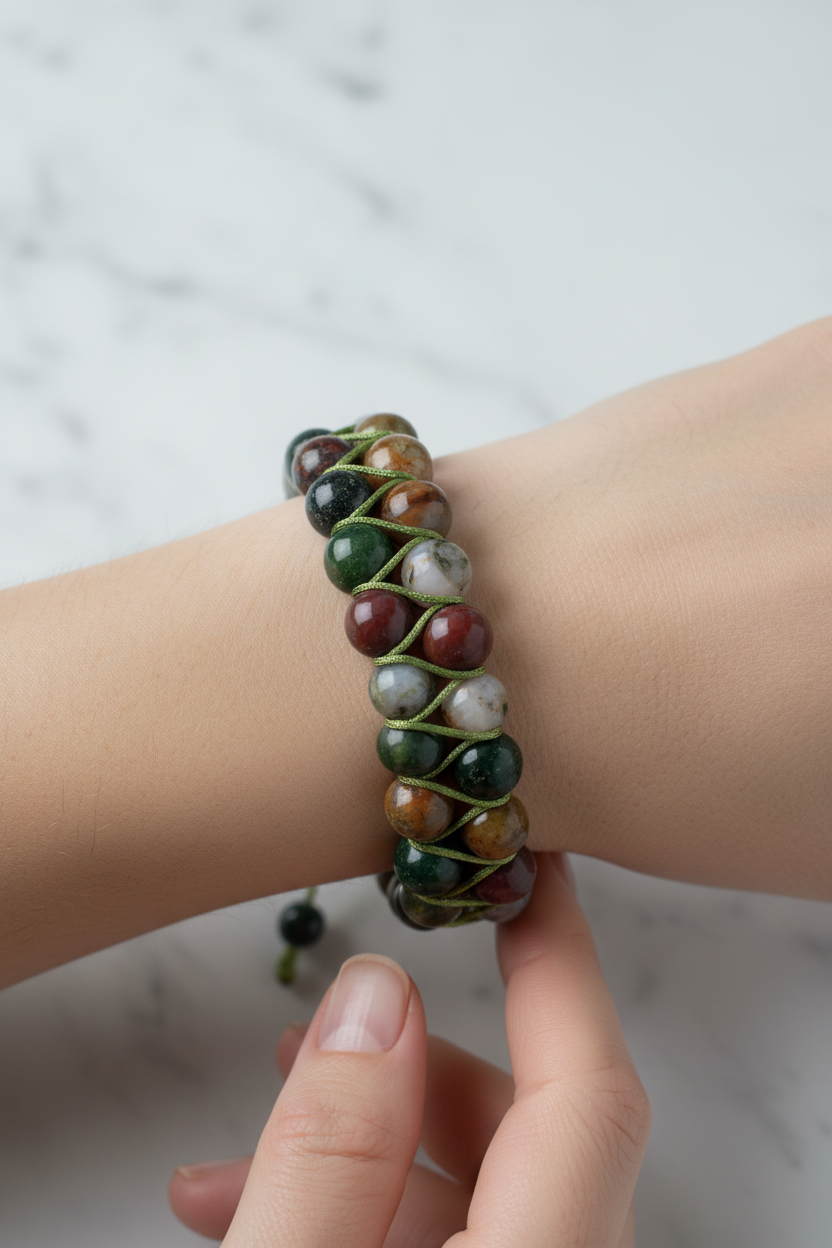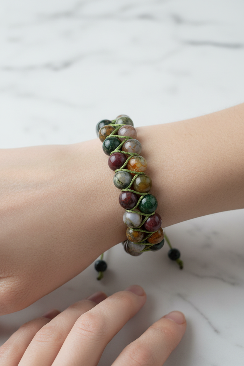 Yeşil, kahverengi ve krem tonlarının doğal uyumunu yansıtan Hint Akiği 8mm Çift Sıra Makrome Doğal Taş Bileklik, zarif ve güçlü tasarımıyla bilekte dikkat çeker. 8mm çapındaki doğal hint akiği taşları çift sıra halinde dizilmiş, el yapımı makrome örgü tekniğiyle hazırlanmıştır. Günlük kombinlerde estetik bir detay, özel davetlerde ise sofistike bir tamamlayıcı aksesuar olarak tercih edilebilir.