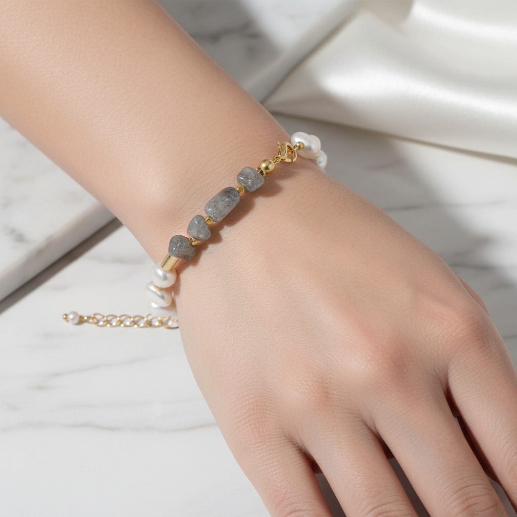 İnci & Labradorit Altın Kaplama Kapama Doğal Taş Bileklik – El İşçiliği
