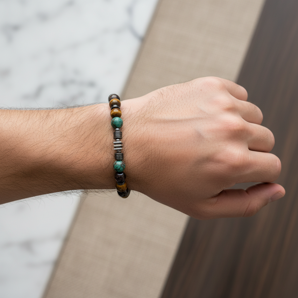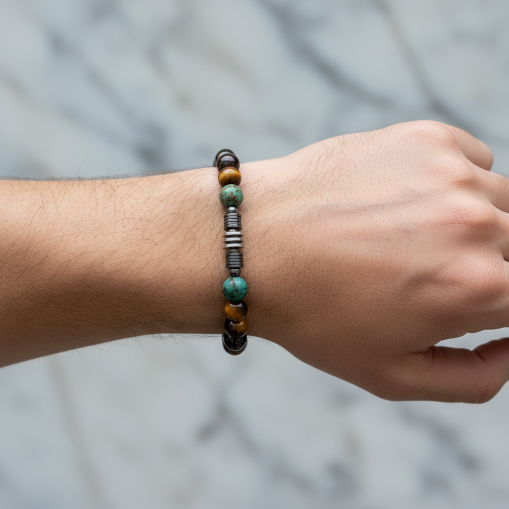 Kaplan gözünün altın kahverengi yansımaları, bordo granat lal taşının derin kırmızısı ve krizokolun eşsiz mavi-yeşil tonları bir araya gelerek özgün bir erkek bileklik tasarımı ortaya çıkarıyor. El işçiliğiyle hazırlanmış bu özel tasarım, maskülen tarzı modern detaylarla buluşturur. Günlük kullanıma dayanıklı yapısıyla öne çıkan bileklik, özel günlerde de karizmatik bir tamamlayıcıdır.