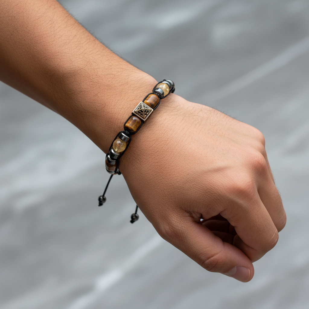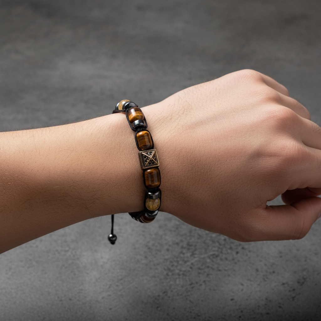 Kaplan Gözü, Sitrin & Hematit Doğal Taş Erkek Zirkon Detaylı Bileklik – Özel Tasarım