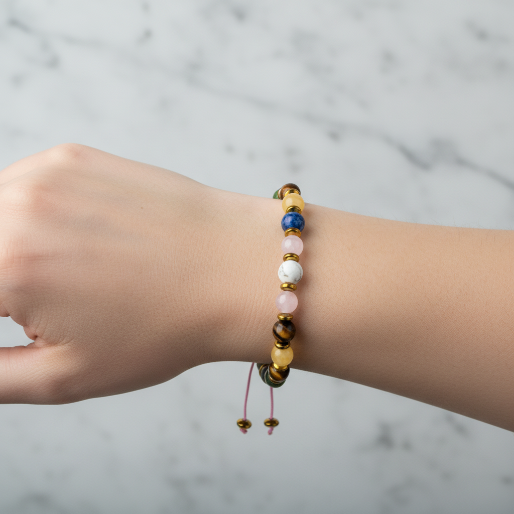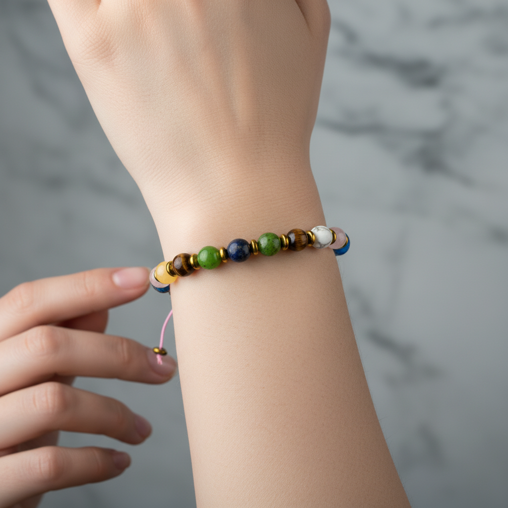 Kız öğrenciler için özel olarak tasarlanan bu bileklik, dokuz farklı doğal taşın zarif uyumunu modern bir çizgide bir araya getiriyor. Havlitin beyaz dokusu, pembe kuvarsın romantik ışıltısı, labradoritin gizemli parlamaları, lapis lazulinin asil mavisi, kalsitin yumuşak tonları, yeşimin doğal canlılığı, dumanlı kuvarsın şeffaf gri dokusu, sodalitin derin mavisi ve kaplan gözünün altın yansımaları el işçiliğiyle özenle hazırlanmış bu tasarımda buluşuyor. Günlük kullanım için zarif, şık ve dayanıklı bir tamamlayıcıdır.