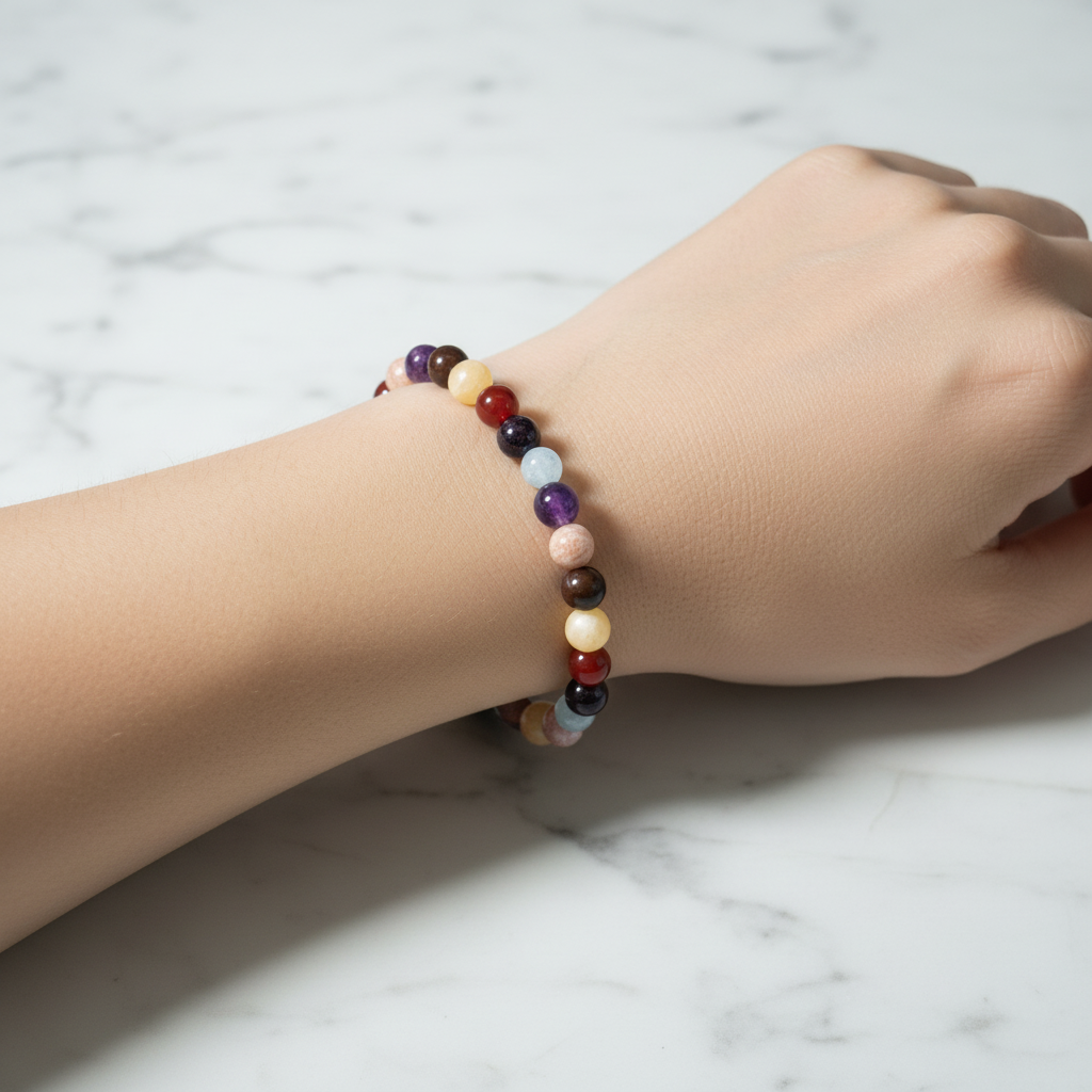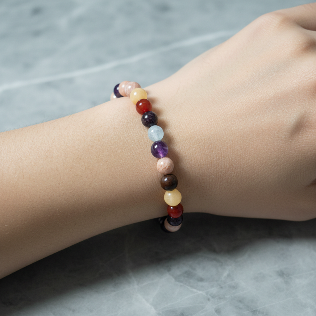 Koç Burcu Doğal Taş Bileklik – Akuamarin, Ametist, Granat Lal, Güneş Taşı, Kalsit, Kan Taşı, Kırmızı Akik & Yeşil Aventurin