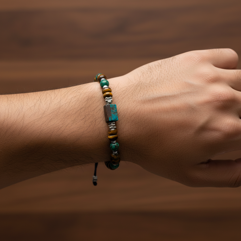 Krizokolun mavi-yeşil dokusu, kaplan gözünün altın kahverengi yansımaları, azurit malakit taşının derin desenleri ve hematitin metalik parlaklığı 925 ayar gümüş detaylarla birleşerek güçlü ve maskülen bir bileklik tasarımı ortaya çıkarıyor. El işçiliğiyle özenle hazırlanmış bu özel parça; günlük kombinlerde karizmatik bir dokunuş sunarken, özel günlerde de sofistike bir tamamlayıcıdır.