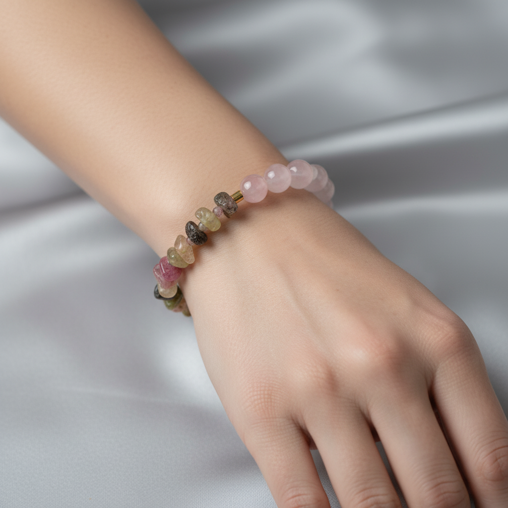 Renkli Turmalin & Pembe Kuvars Doğal Taş Bileklik – Özel Tasarım