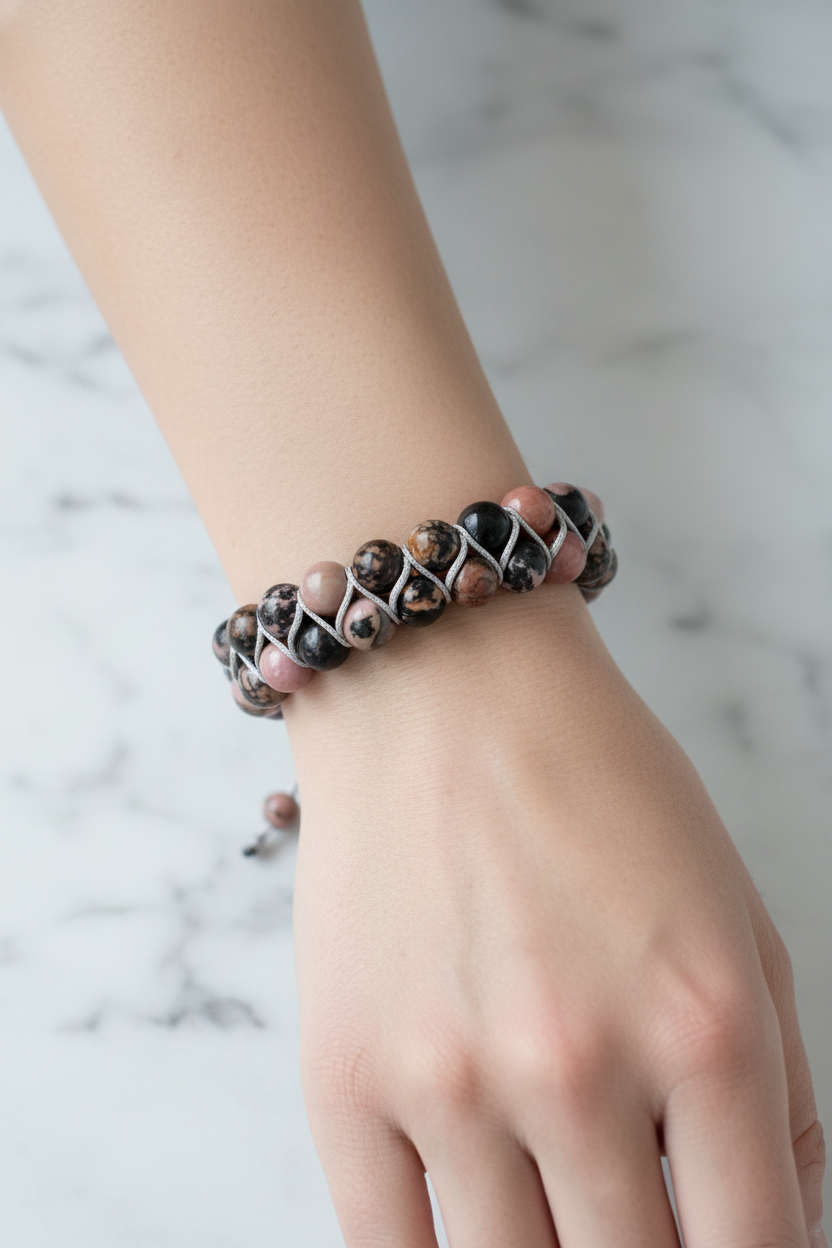 Pembe tonları ve doğal damar desenleriyle öne çıkan Rodonit 8mm Çift Sıra Makrome Doğal Taş Bileklik, zarif ve modern tasarımıyla stilinize sofistike bir dokunuş katar. 8mm çapındaki doğal rodonit taşları çift sıra halinde dizilmiş, el yapımı makrome örgü tekniğiyle birleştirilmiştir. Günlük kombinlerde zarif bir detay sunarken, özel anlarda da şıklığınızı tamamlayan dikkat çekici bir aksesuar olarak öne çıkar.