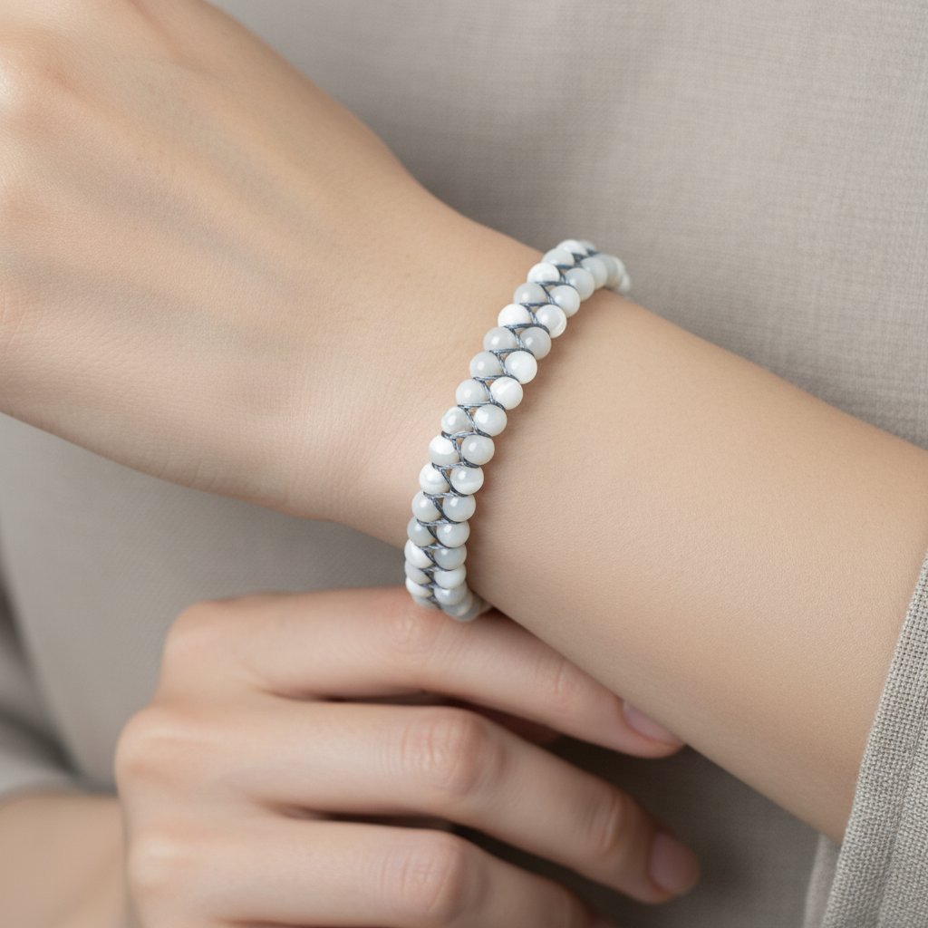 Sedef Beyaz 4mm Çift Sıra Doğal Taş Makrome Bileklik – El İşçiliği