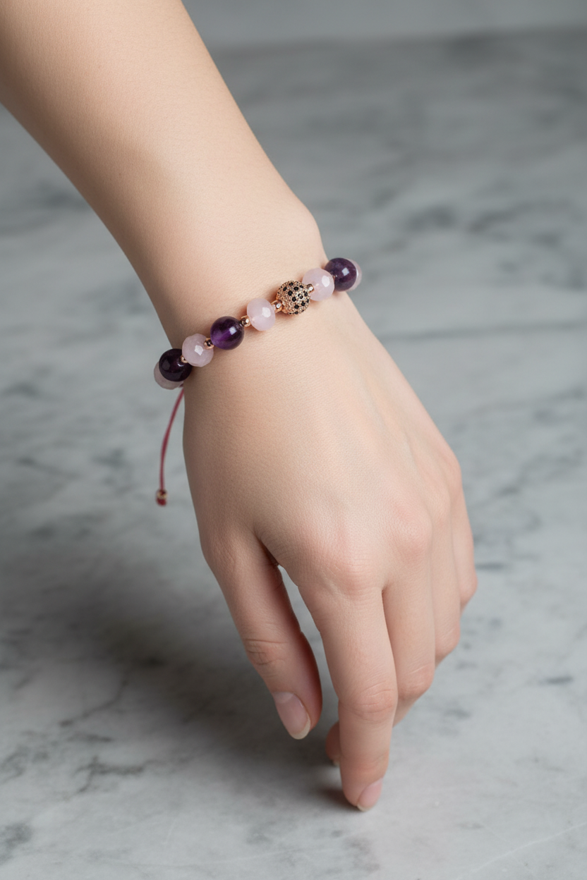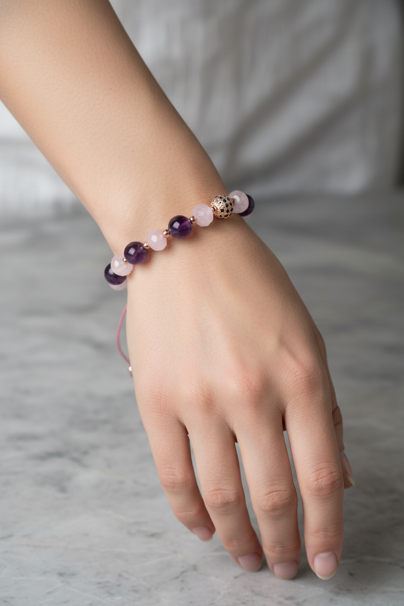 Ametist ve Pembe Kuvars Doğal Taş Bileklik – Unisex Şık Tasarım