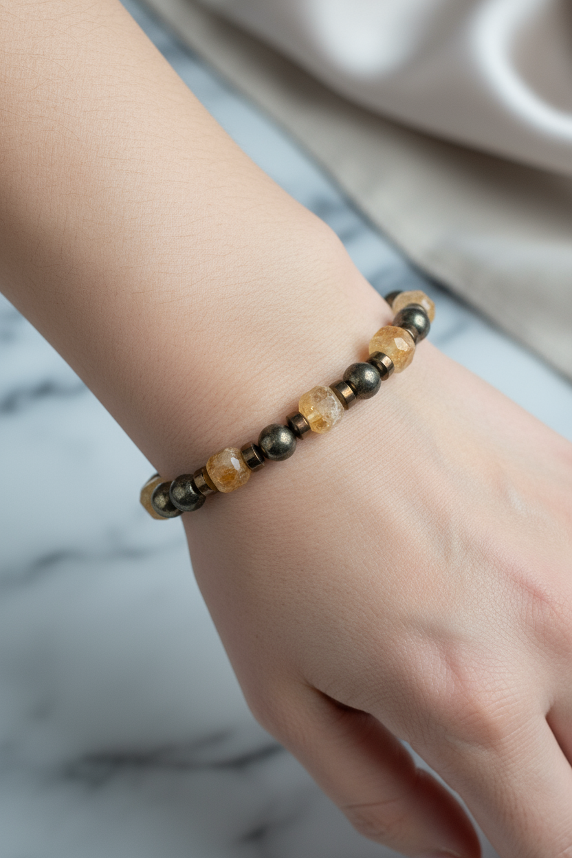 Pirit, Sitrin ve Hematit Doğal Taş Bileklik – 8 mm Misinalı, Unisex Tasarım