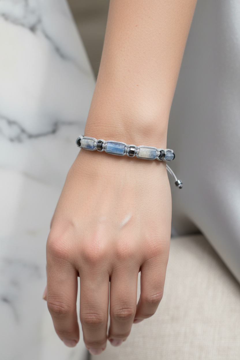Kiyanitin derin mavisini hematitin güçlü parlaklığıyla buluşturan bu köşeli makrome ipli bileklik; koleksiyonuna modern, zarif ve karakterli bir parça eklemek isteyenler için ideal seçimdir.
