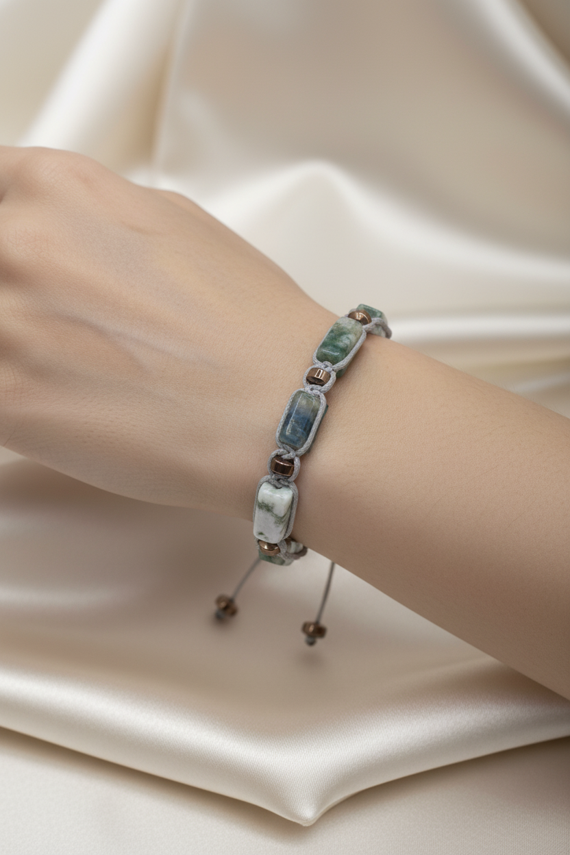 Yosunlu Akik ve Hematit Doğal Taş Bileklik – İpli Köşeli Makrome Model, Unisex Tasarım