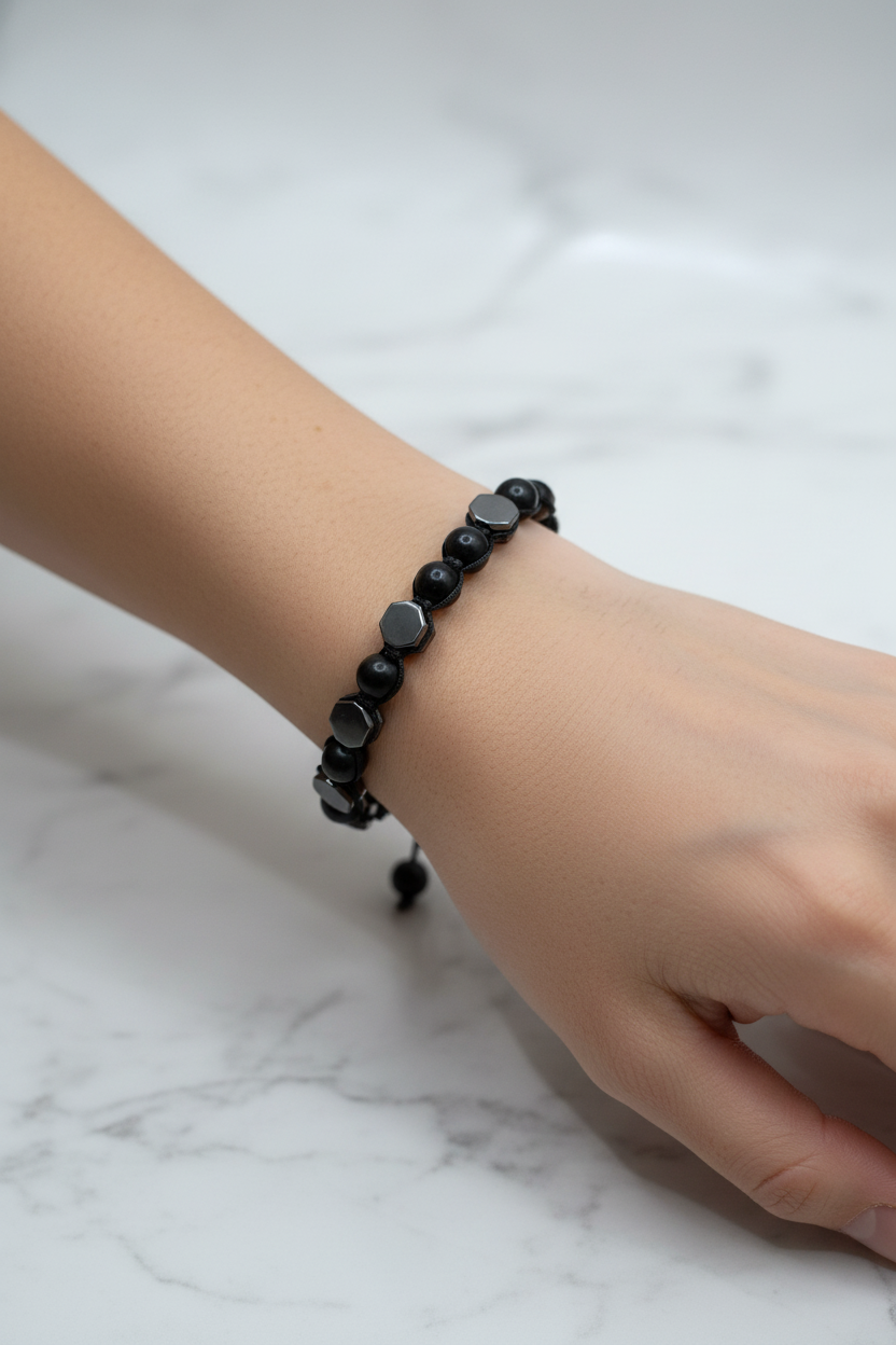 Hematit & Şungit Doğal Taş Makrome Bileklik – Ayarlanabilir Tasarım
