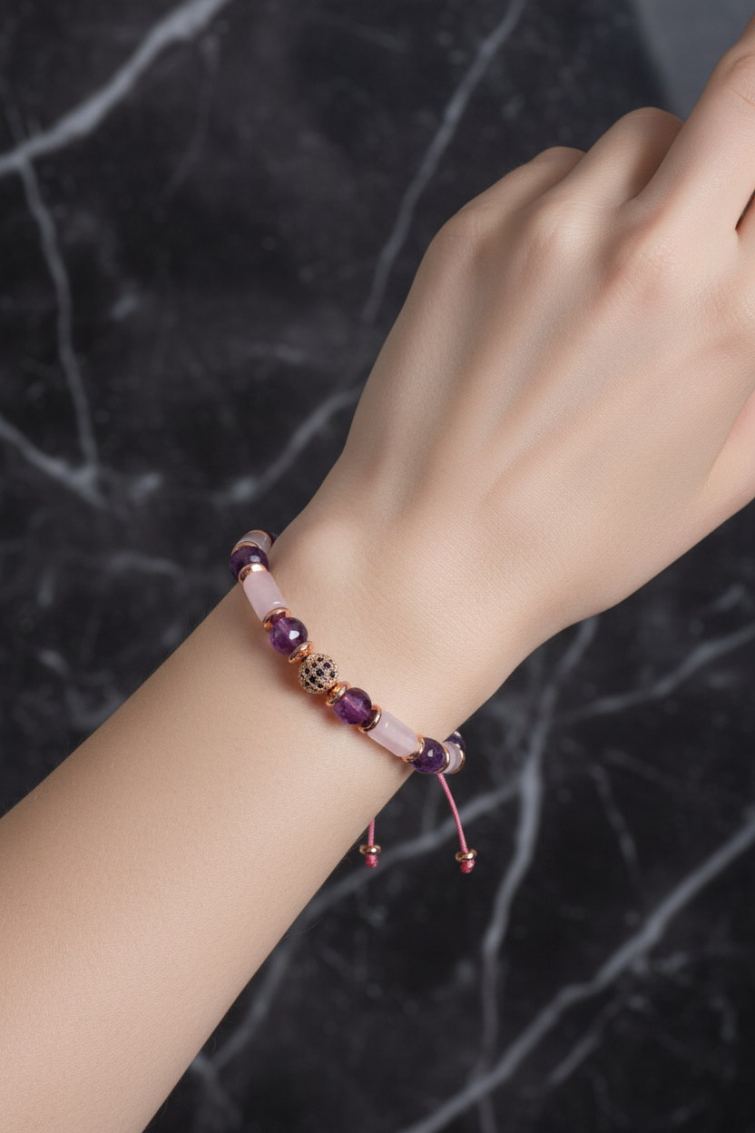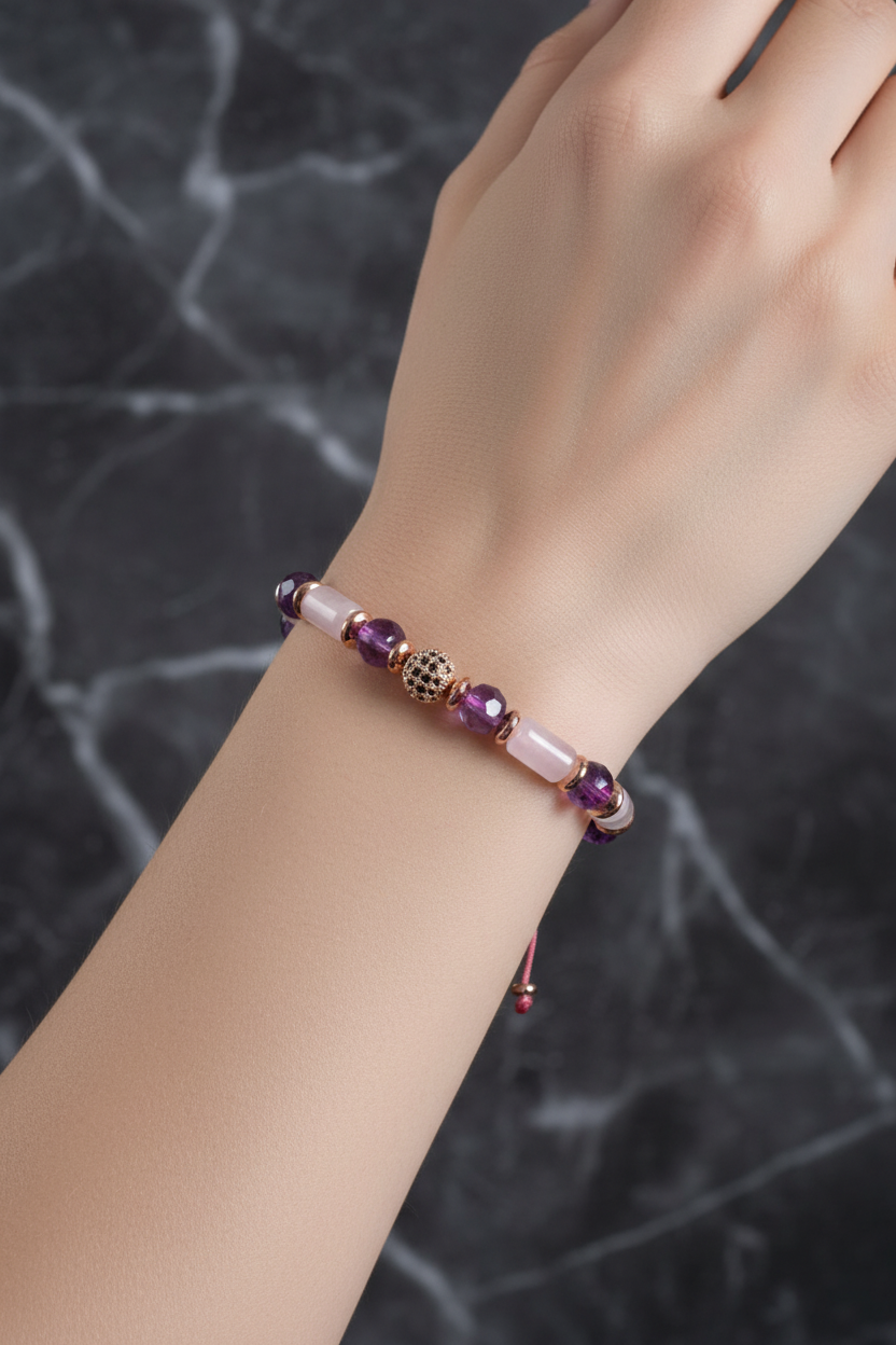 Pembe kuvarsın romantik pembesini, ametistin asil mor tonunu ve hematitin güçlü ışıltısını bir araya getiren bu bileklik; koleksiyonuna modern ve zarif bir parça eklemek isteyenler için ideal seçimdir.