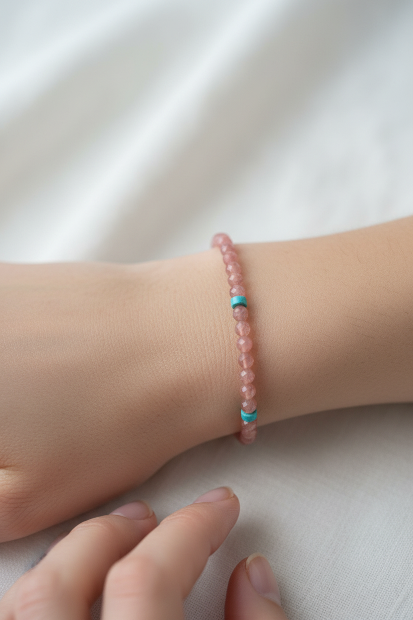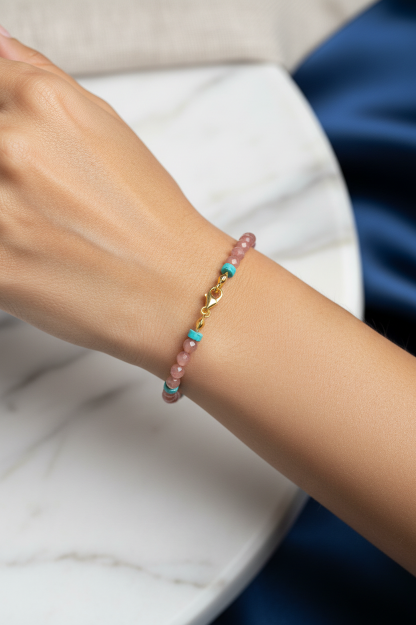 Rodokrozit ve turkuaz taşlarının zarif uyumuyla tasarlanan bu doğal taş bileklik, gümüş kapama detayıyla modern ve estetik bir görünüm kazanır. El işçiliğiyle özenle hazırlanmış tasarım, günlük kullanımda ve özel günlerde şıklığınızı tamamlayan şık bir aksesuardır.