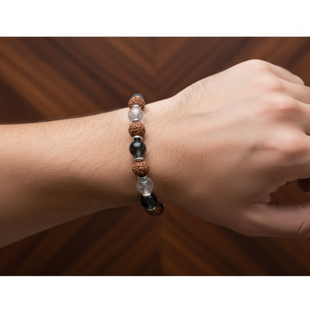Rutilli Kuvars, Rudraksha ve Hematit Doğal Taş Bileklik – Unisex Şık Tasarım