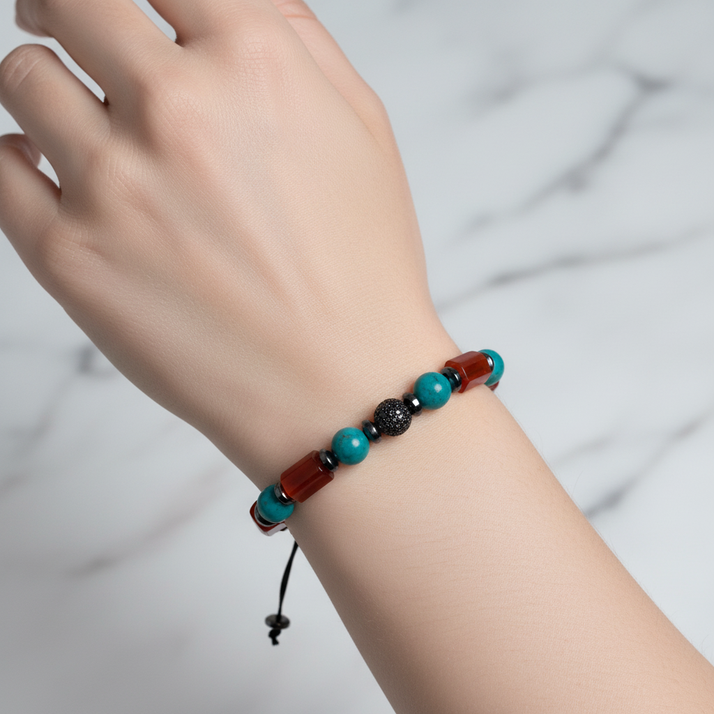 Turkuazın göz alıcı rengi, akik taşının doğal dokusu ve hematitin güçlü ışıltısını zirkon aparatıyla buluşturan bu bileklik, koleksiyonuna modern ve şık bir parça eklemek isteyenler için ideal bir seçimdir.