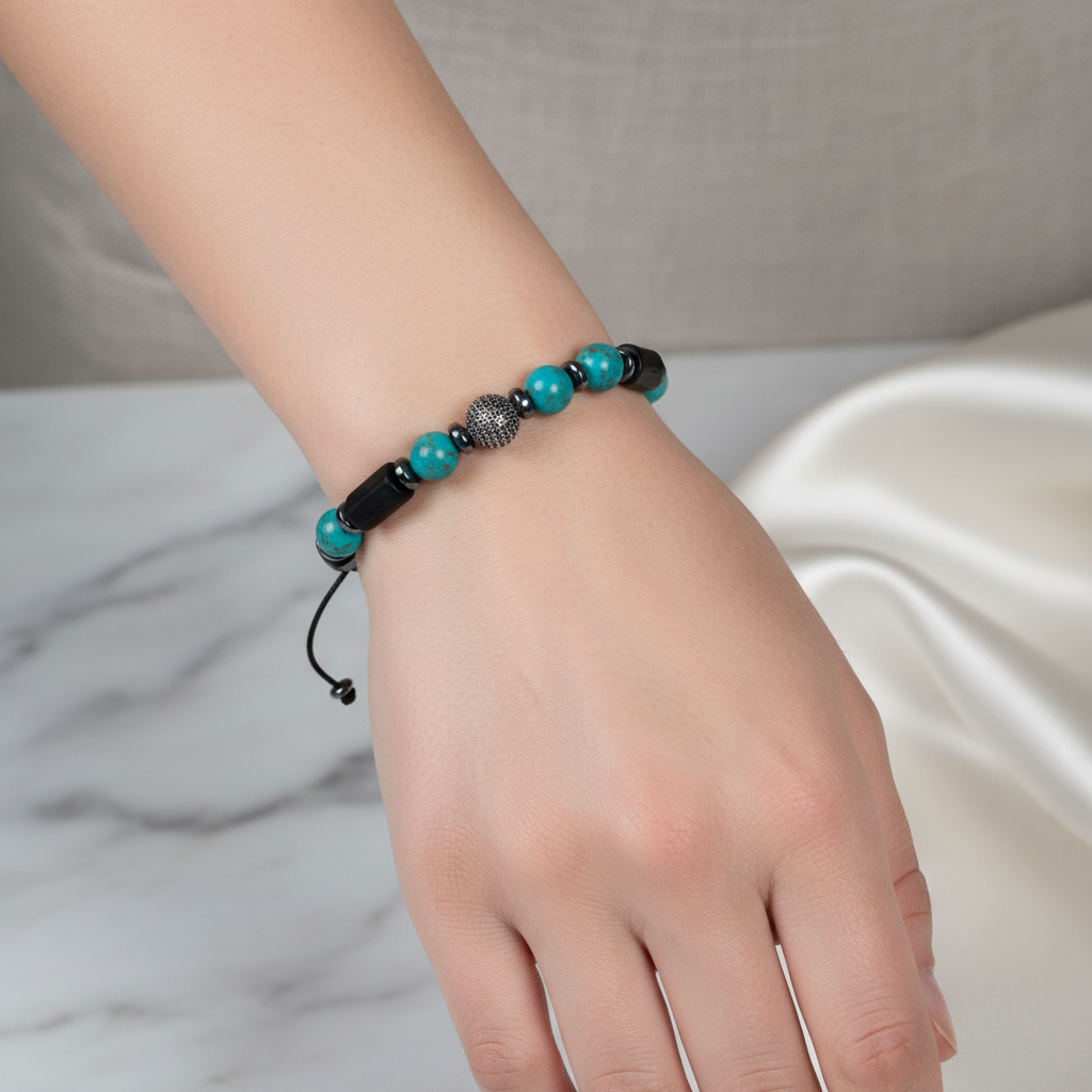 Turkuaz, Şungit ve Hematit Doğal Taş Makrome Bileklik – Gümüş Aparatlı, Ayarlanabilir Tasarım