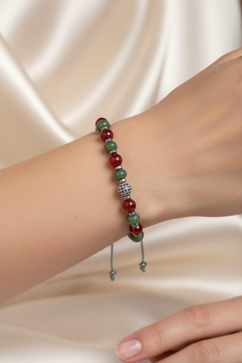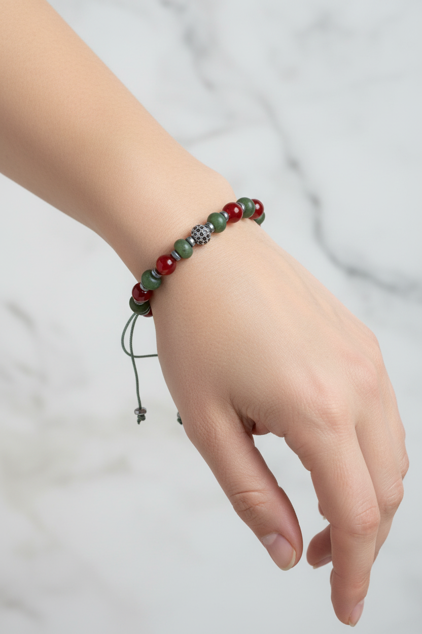 Sertifikalı Yeşim ve Kırmızı Akik Doğal Taş Bileklik – Zirkon Aparatlı, Unisex Şık Tasarım