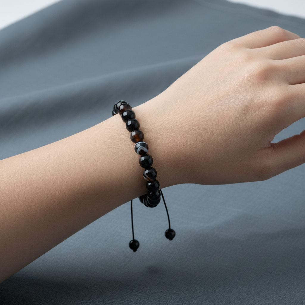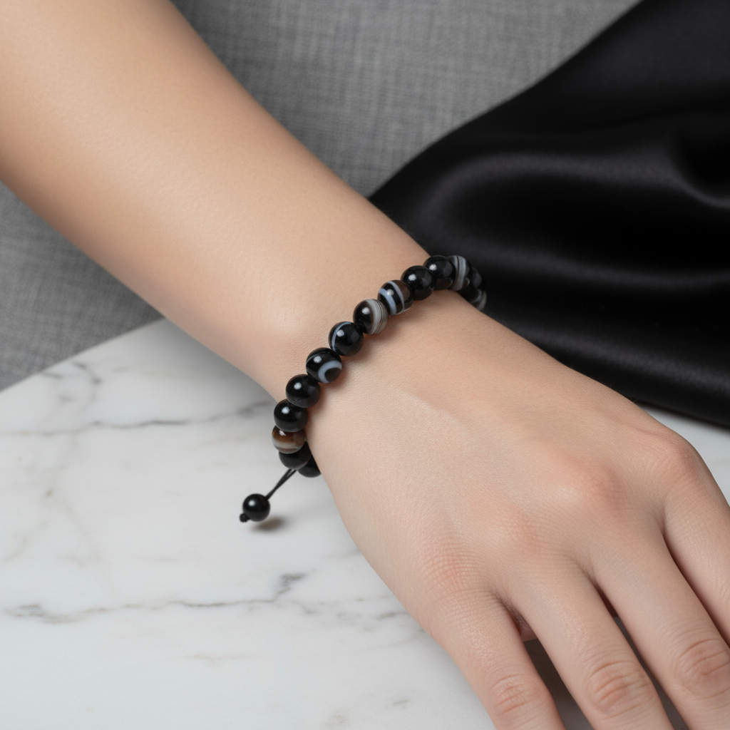 Siyah Göz Akik 8 mm Merdiven Kapama Doğal Taş Bileklik – El İşçiliği