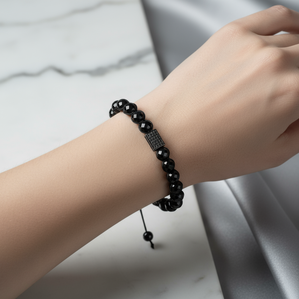 Siyah Göz Akik ve Zirkon Doğal Taş Bileklik – Unisex Şık Tasarım