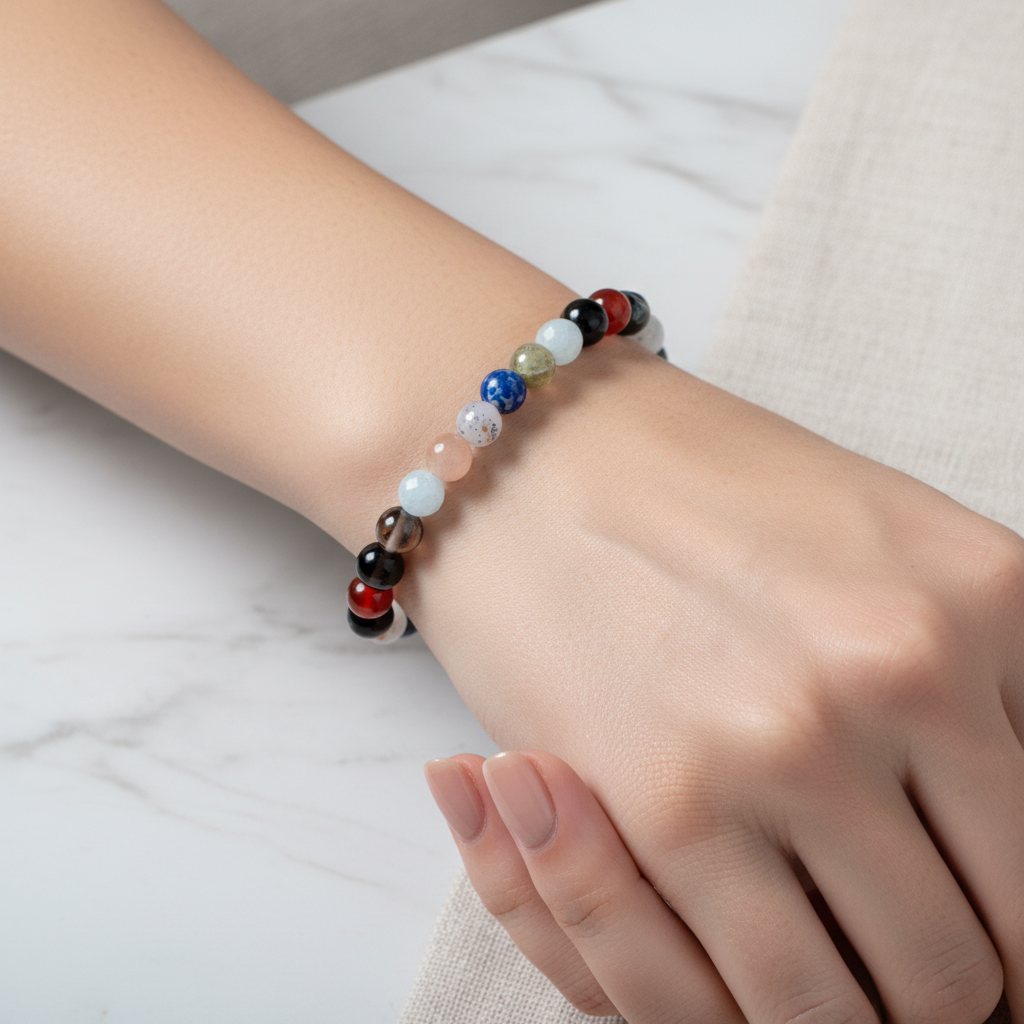 Terazi Burcu Doğal Taş Bileklik – Akuamarin, Ay Taşı, Dumanlı Kuvars, Obsidyen, Güneş Taşı, Akik, Labradorit & Lapis Lazuli