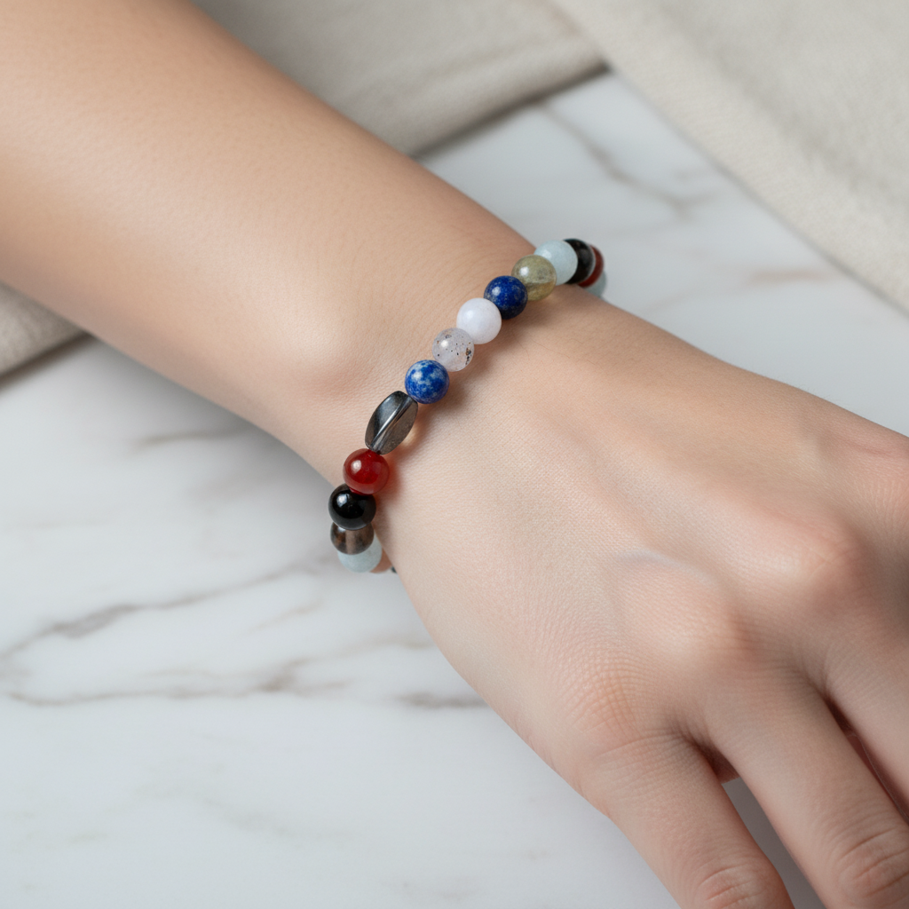 Terazi Burcu Bileklik Akuamarin, Ay Taşı, Dumanlı Kuvars, Golden Obsidyen, Güneş Taşı, Kırmızı Akik, Labradorit, Lapis Lazuli